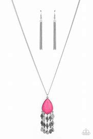 A vivacious pink stone teardrop pendant swings from the bottom of a lengthened silver chain. Tassels of silver teardrop frames trickle from the bottom of the colorful pendant, creating a musical fringe. Features an adjustable clasp closure.