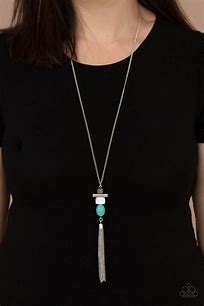A square wooden frame, silver rod, piece of white shell, and oval turquoise stone stack into a seasonal pendant at the bottom of a lengthened silver chain. A shimmery silver chain tassel swings from the frame, adding playful movement to the earthy display. Features an adjustable clasp closure.