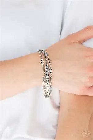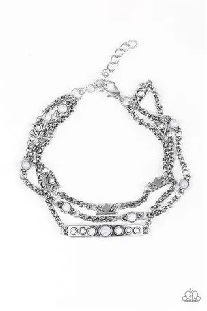 Featuring dainty gray stone accents, dainty silver triangles, round frames, and a stone studded plate trickle along three shimmery silver chains across the wrist for a seasonal look. Features an adjustable clasp closure.