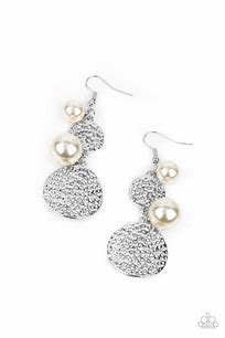 Oversized white pearls and hammered silver discs delicately link into a bubbly lure for a refined flair. Earring attaches to a standard fishhook fitting.