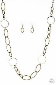 An array of smooth and textured brass hoops connect across the chest, creating a bold mismatched palette. Features an adjustable clasp closure.