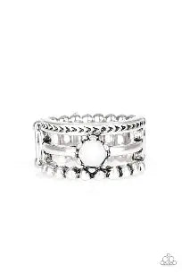 A trio of studded, smooth, and tribal stamped silver bands layer across the finger, coalescing into an airy frame. A shiny white bead is pressed into the center of the shimmery layers for a perfect pop of color. Features a stretchy band for a flexible fit.