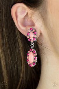 Bordered in dainty Burnt Coral and Raspberry Sorbet beads, a pair of marquise and oval Burnt Coral beads delicately link into a colorful lure for a fresh pop of color. Earring attaches to a standard clip-on fitting.