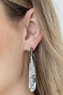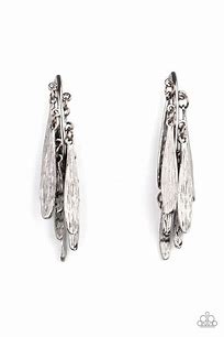 Textured petal-like plumes cluster around a curved black bar and dance in an unexpected funky fringe below the ear. Earring attaches to a standard post fitting.