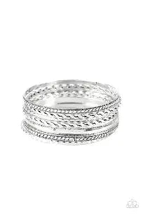 Featuring an array of tribal inspired textures, mismatched silver bangles stack across the wrist for a seasonal look.