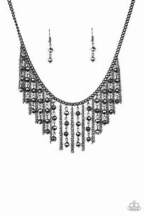 Strands of faceted gunmetal beads and glistening gunmetal chains stream from a matching gunmetal chain, creating an edgy fringe below the collar. Features an adjustable clasp closure.