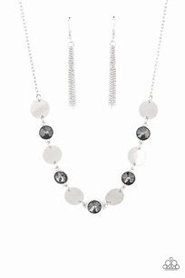 Shiny silver discs and oversized smoky gems delicately link below the collar, creating a sparkly statement piece. Features an adjustable clasp closure.