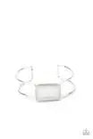 A glassy, emerald cut white gem adorns the center of an airy silver cuff for a refined flair.