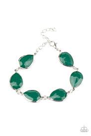 Encased in sleek silver frames, faceted green acrylic teardrops delicately link around the wrist for an elegant pop of color. Features an adjustable clasp closure.