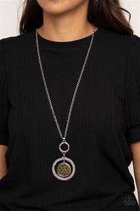 Bordered in an asymmetrical silver frame, a hammered brass disc swings from the top of an imperfect hoop that links to a studded silver ring, creating an authentically artisan pendant at the bottom of an antiqued silver chain. Features an adjustable clasp closure.