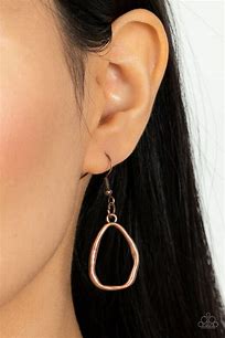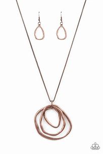 A trio of mismatched warped copper rings swing from the bottom of an antiqued copper chain, creating a rustically stacked pendant. Features an adjustable clasp closure.