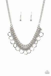 Rows of shiny silver beads and hammered rings swing from the bottom of interlocking silver chains, creating a bold fringe below the collar. Features an adjustable clasp closure.