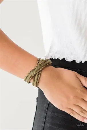 Rows of classic brass chain, flat brass chain, and dainty aurum rhinestones are encrusted along a brown suede band dusted in golden sparkles for a sassy look. The elongated band allows for a trendy double wrap design. Features an adjustable snap closure.