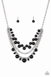 Varying in size, black beads, black crystal-like beads, and faceted silver beads join with mismatched silver chains below the collar, creating a radically refined fringe. Features an adjustable clasp closure.