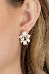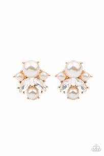 Featuring shiny silver fittings, a royal collection of bubbly pearls and glassy marquise cut white rhinestones delicately cluster into an elegant frame. Earring attaches to a standard post fitting.
