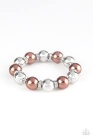 A collection of white rhinestone encrusted rings, brown pearls, and classic silver beads are threaded along a stretchy band around the wrist for a glamorous look.