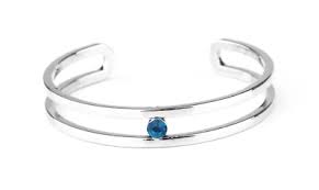 A dainty blue Peacock rhinestone is nestled inside the center of an airy silver cuff, adding a glittery pop of color to the wrist.