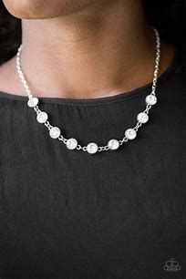 Encased in studded silver frames, glittery white rhinestones link below the collar for a glamorous look. Features an adjustable clasp closure.