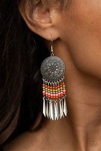 Rust, Brunt Coral, green, and silver beaded tassels swing from the bottom of an oversized silver disc embossed in an antiqued sunburst. Flared silver bars attach to the bottoms of the beaded tassels, creating an edgy fringe. Earring attaches to a standard fishhook fitting.