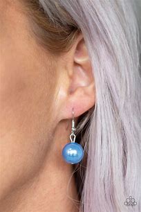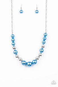 A collection of oversized silver and pearly blue beads drape across the chest for a refined look. Features an adjustable clasp closure.