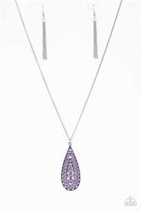 Brushed in a vivacious purple finish, a bubbly silver teardrop swings from the bottom of an elongated silver chain for a tribal inspired look. Features an adjustable clasp closure. Sold as one individual necklace. Includes one pair of matching earrings.