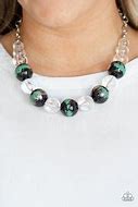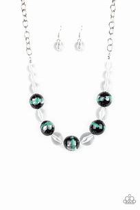A collection of shiny black and glassy clear beads are threaded along an invisible wire below the collar. The black beads are splashed in hints of refreshing green and shiny metallic paint for a colorful finish. Features an adjustable clasp closure.