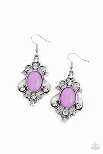 Dotted with glittery white rhinestones, antiqued silver filigree flares out from an opalescent Amethyst Orchid gem, creating an enchanting chandelier. Earring attaches to a standard fishhook fitting.