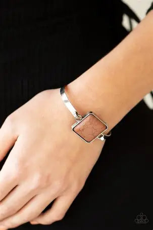 A brown square stone frame links with one side of a shiny silver cuff, while the other side of the earthy frame hinges to the other side, creating a versatile fit. Features a hinged closure.