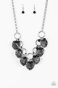 Infused with shiny black beads, vintage locket-like heart frames swing from the bottoms of bold silver hoops, creating a flirtatious fringe below the collar. Features an adjustable clasp closure.