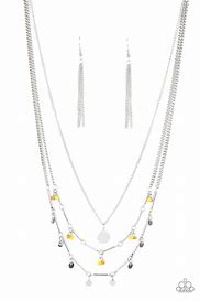 A silver disc is suspended above two mismatched silver chains featuring a mismatched array of silver bars, silver discs, and pairs of brown and yellow seed beads. The dainty display delicately layers below the collar, creating a colorful fringe. Features an adjustable clasp closure.