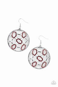 Fun silver and red rhinestone ovals playfully fill a round silver frame. Earring attaches to a standard fishhook fitting.