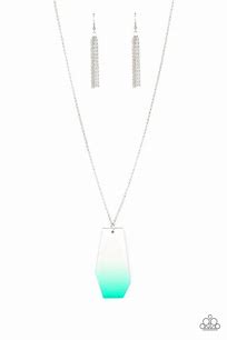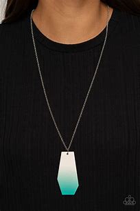 An abstract wooden piece gradually fades from white to blue, creating a colorful ombre inspired pendant at the bottom of a silver chain. Features an adjustable clasp closure.