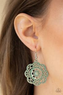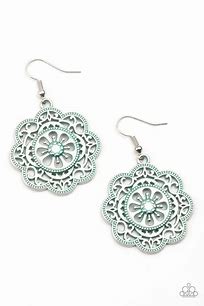 Featuring a rustic patina finish, a decorative mandala-like silver frame swings from the ear for a whimsical look. Earring attaches to a standard fishhook fitting.
