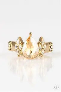 A dramatic golden teardrop gem is pressed into the center of a dainty gold band. Featuring regal marquise-cuts, dainty golden rhinestones flank the sparkling teardrop center for a glamorous finish. Features a dainty stretchy band.