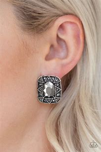An oval hematite gem is pressed into a square silver frame radiating with glittery hematite rhinestones and triangular patterns for an edgy refinement. Earring attaches to a standard post fitting.