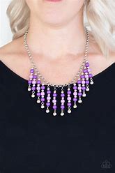 A collection of dark purple, light purple, and silver beads are threaded along metallic rods as they swing from the bottom of a shimmery silver chain, creating a flirtatious fringe below the collar. Features an adjustable clasp closure.