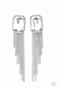 Tapered silver chains stream from the bottom of an oversized white emerald cut gem, creating a regal fringe. Earring attaches to a standard post fitting.